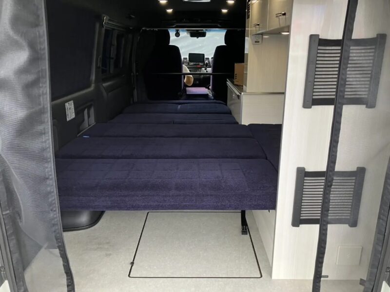 まず、 このお車の最大の魅力は広々としたベッドキットです。例えば、 満開の桜の下に車を止めれば、車内がそのまま絶景の特等席に早変わりします。